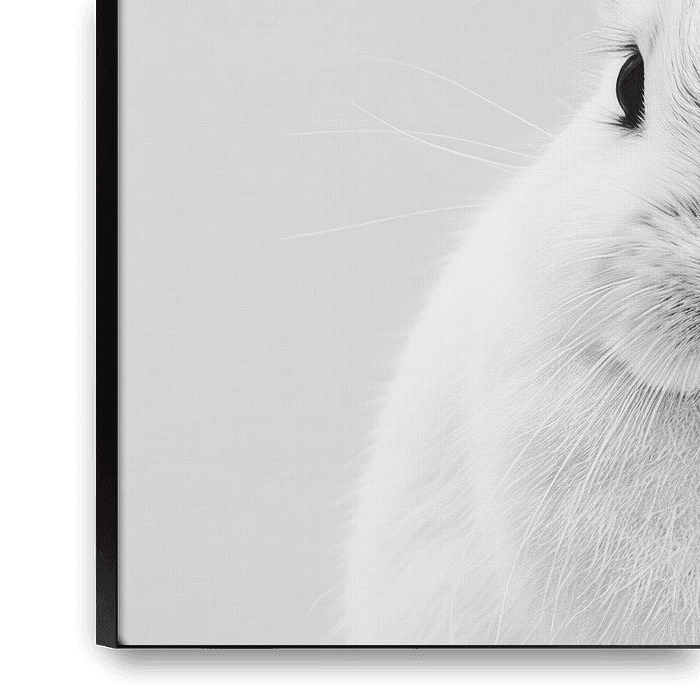 This black and white photographic artwork captures the calm and delicate beauty of a rabbit in a remarkable way. The minimalist composition draws the focus to the fine details of the fur and the expressive eyes, creating a timeless elegance. The clean lines and high-contrast light make this work of art a perfect highlight for modern…
