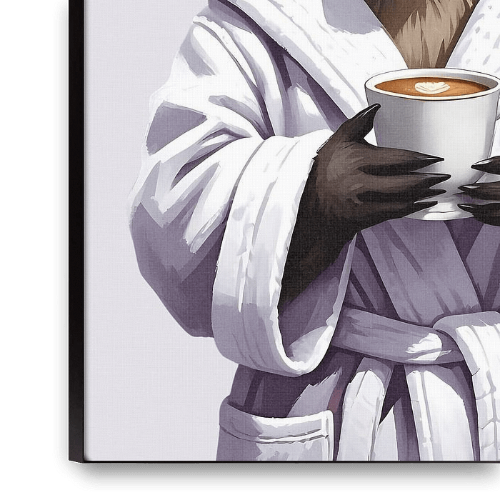 A style-conscious raccoon in a white bathrobe, perfectly positioned round sunglasses and a freshly brewed cup of coffee with latte art in its paws - this moment combines cosiness and character. The light background and subtle contrasts emphasise the calm aura of the motif.
