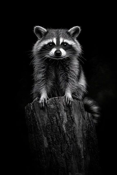 A mischievous raccoon, perched on a weathered wooden trunk, catches the eye with its large, inquisitive eyes and striking face mask. The black and white contrast gives the picture a mysterious aura that can stimulate lively conversation in a living room. Ideal as a warm accent with a touch of nature.