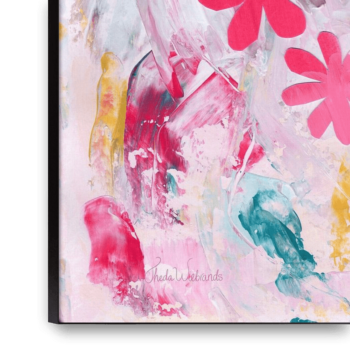 Buy this abstract artwork Radiance - Abstract Flower Painting | Modern Wall Art in Blue, Pink and Yellow by Theda Wiebrands on canvas, ArtFrame, poster and wallpaper, printed on demand in high quality.