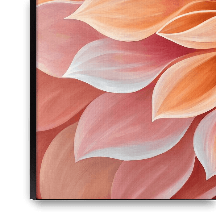 A vibrant close-up captures the intricate details and warm hues of a dahlia in full bloom. The petals, ranging from soft peach and blush pink to fiery orange, unfurl in a mesmerizing spiral, drawing the viewer into the heart of the flower. The play of light and shadow accentuates the delicate texture and layered composition of this…
