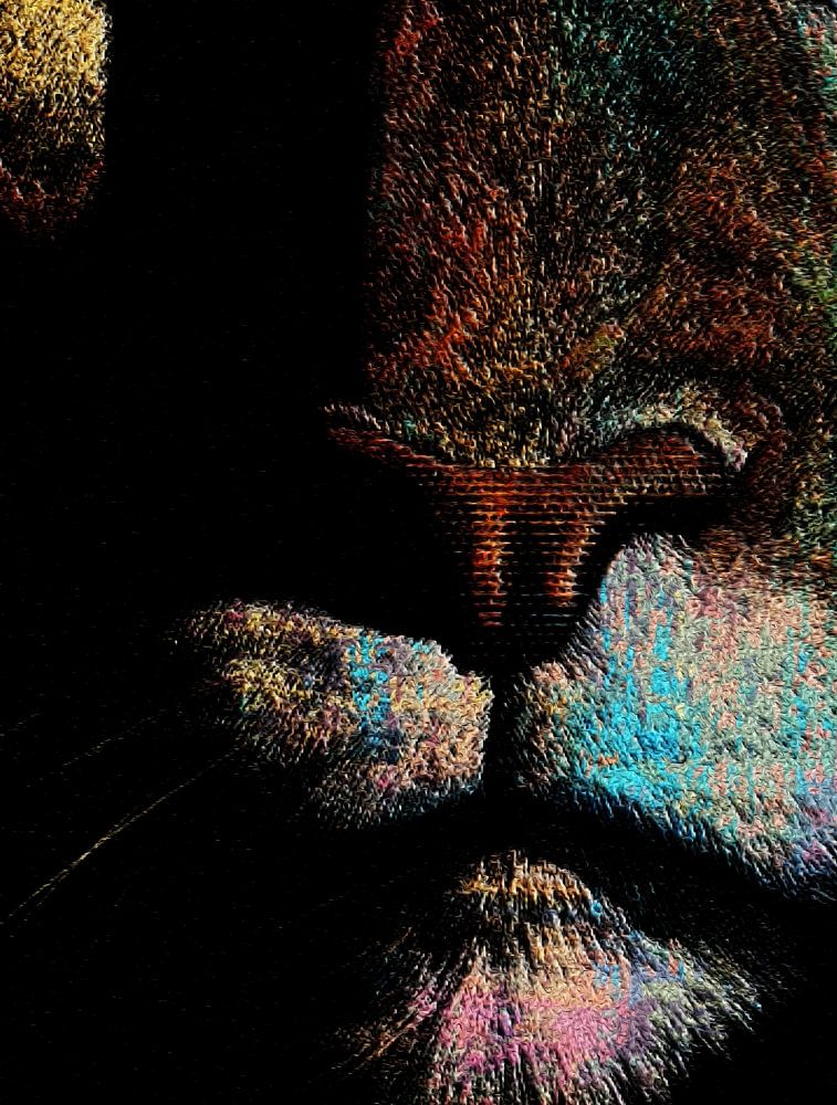 Explore the captivating artwork of a lioness's face emerging from complete darkness, adorned with a palette of vibrant hues. Despite the surrounding shadows, the blend of attractive colors imparts a beautiful radiance, evoking a sense of both fear and heightened alertness.