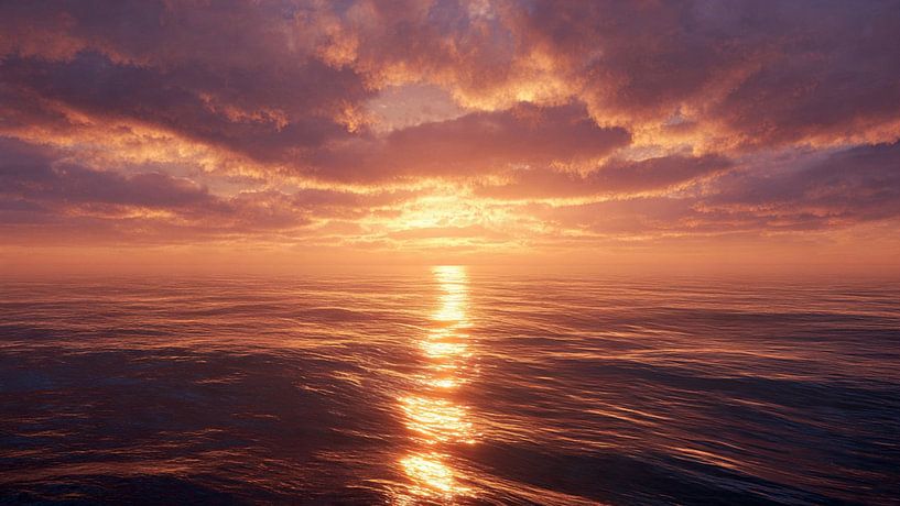 This stunning digital landscape captures the ethereal beauty of a sunset over a vast, tranquil ocean. The horizon is set ablaze with warm hues of amber, gold, and soft violet, reflecting brilliantly across the gentle ripples of the water's surface. The dramatic cloud formations add a sense of depth and movement, creating a serene yet…