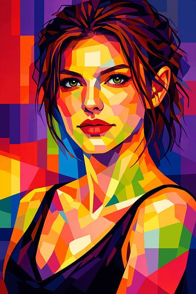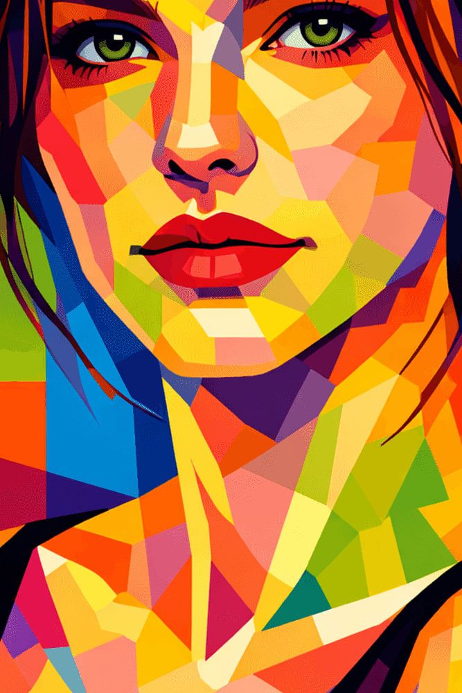"A striking geometric woman portrait in bold polygonal pop art style. Radiant colors in red, yellow, blue and violet create a modern abstract composition that feels both energetic and contemplative. The closed eyes and soft facial expression bring a sense of calm balance against the vibrant background, making this artwork perfect for…