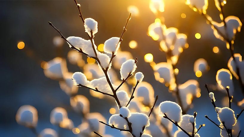 On a snowy winter's day, a quiet, almost sacred scene unfolds: bare branches draw fine, delicate lines against the bright sky, their contours covered with a delicate layer of powdery snow. The sun is low and emits warm, bright rays that break through the forks of the branches and cast sparkling reflections on the pile of snow. The light…