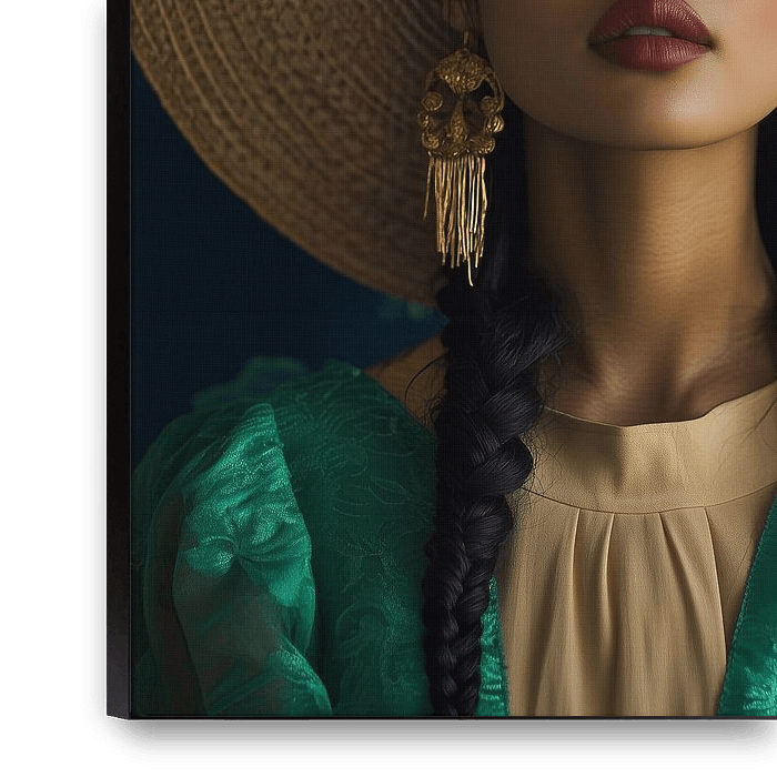 "Radiant in Gold and Green" shows an Asian woman sporting a striking and sophisticated look. She wears a large gold straw hat that gives her look a luxurious and chic look. Her jade-green dress is richly decorated with beige roses, adding an elegant and natural charm. The background is a harmonious blend of blue, beige flowers…