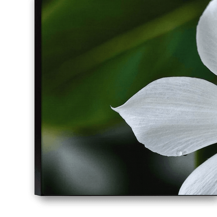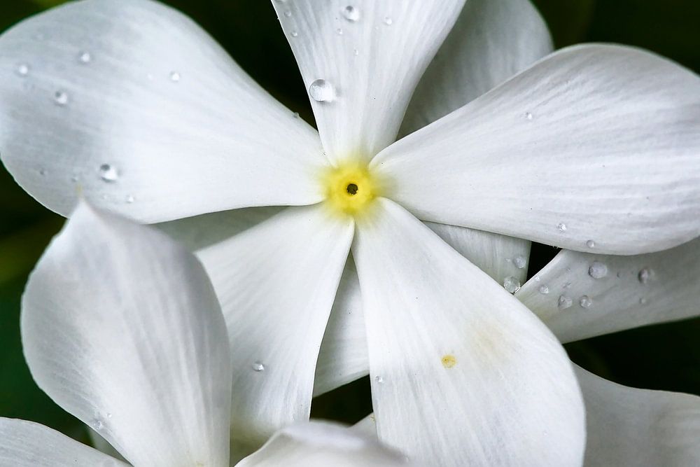 In this image, two delicate white flowers stand out against a background of deep green leaves, creating a striking contrast. Their five perfectly symmetrical petals appear to open in a star shape, revealing an eye-catching pale yellow centre. The silky surface of the petals is adorned with fine droplets of dew, adding a touch of freshness and purity to the scene. The soft light highlights the subtle veins of the petals, emphasising their fine texture. These flowers, typical of tropical climates, give off an impression of calm and serenity, as if inviting a moment of contemplation. The slightly blurred background brings out their immaculate brilliance even more. This type of photographic composition evokes the fragility and perfection of nature, where every detail, from the drop of water to the fold of a petal, tells a silent story. This image captures both the essence of tropical beauty and the serenity we feel when faced with unspoilt nature.