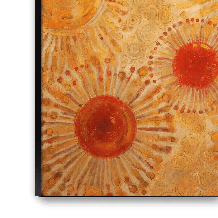 This work exudes the warmth and energy of a summer day, with bright orange and yellow flowers that seem to shine like sunbeams on a light background. The flower shapes are dynamic and vibrant, with concentric circles and rays shooting out from the centre. The texture and colours convey a sense of joy and vitality, making this piece bring an uplifting and cheerful atmosphere to any room. Perfect for those looking to bring a touch of summer and energy into their homes.