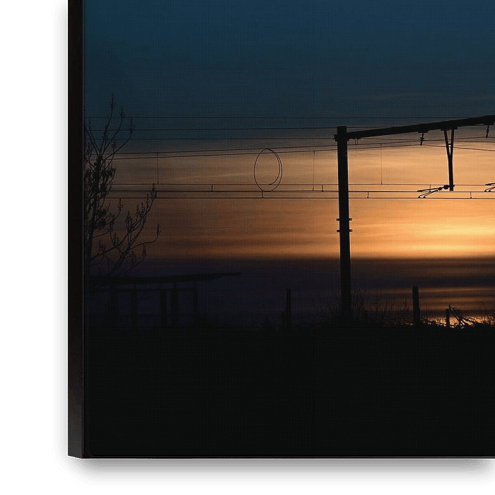 A glow on the horizon under deep blue skies, with graphic railway lines and cables silhouetted against it. Urban-poetic and minimalist—a strong print for modern interiors, offices or studios.