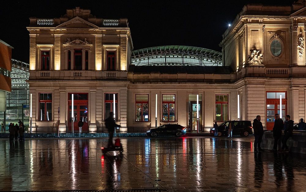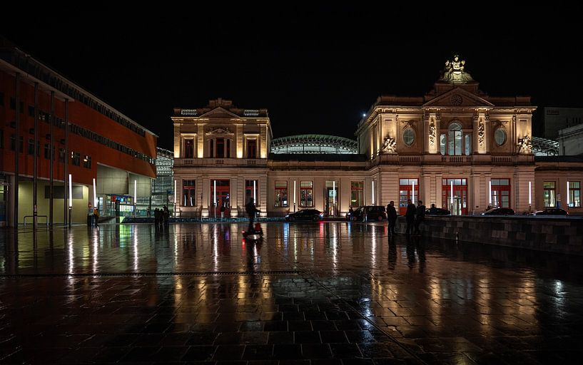 At night and rain, the station square at Martelarenplein in Leuven shows its most atmospheric side. The wet cobblestones turn into a reflective surface in which light, architecture and city come together. The historical station stands firm and dignified in the centre of the picture, surrounded by soft light accents.