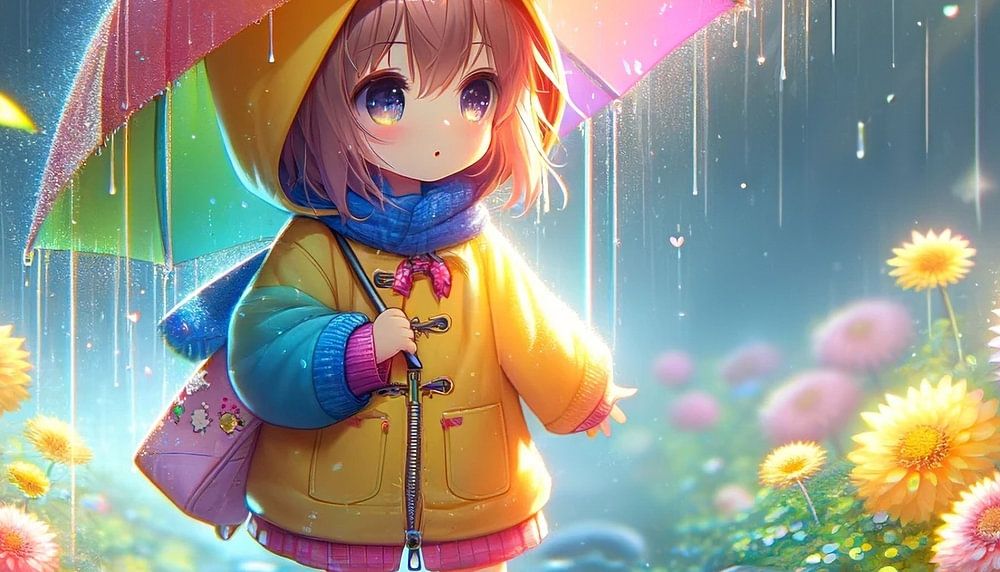 The lively scene shows a little anime-style girl standing under a colourful umbrella surrounded by a rainy floral paradise. The manga depiction is characterised by an explosion of colour and light that creates an almost magical atmosphere. The character, wearing wellies, looks as if she has just brought a page from a cheerful comic book to life. Raindrops dance around her, each one shimmering like a small crystal. The vibrant, rich colours of the flowers contrast with the wet elements, which is typical of the colourful world of a cartoon. This image captures the childlike joy and wonder of the natural world often found in the cheerful world of manga and anime.