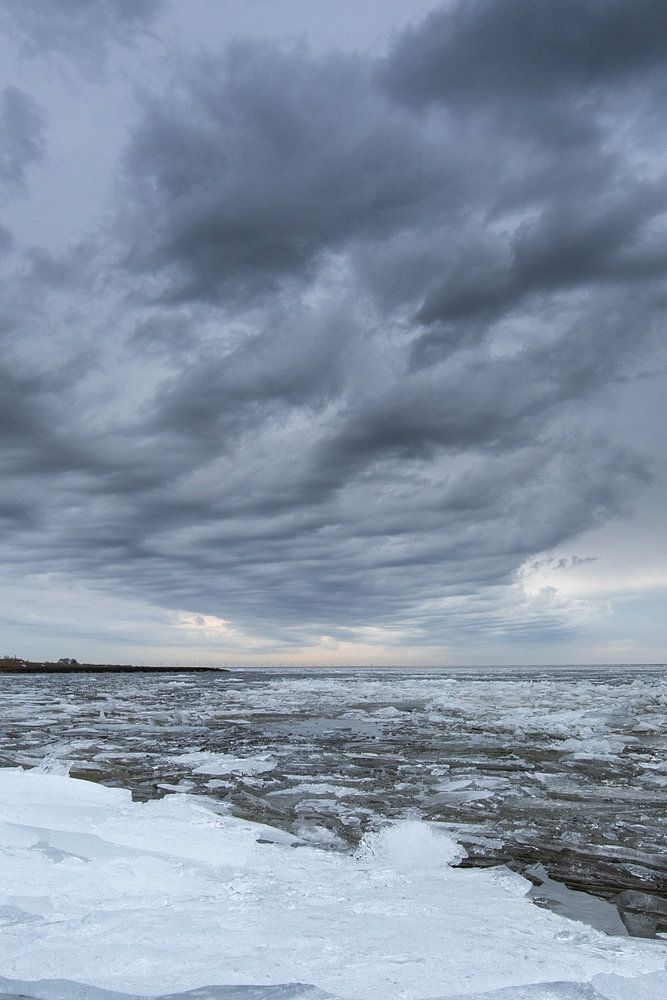 Winter in The Netherlands and drifting ice on the IJsselmeer near Stavoren ziud-west Friesland. A view from a breakwater. Rain above a frozen IJsselmeer