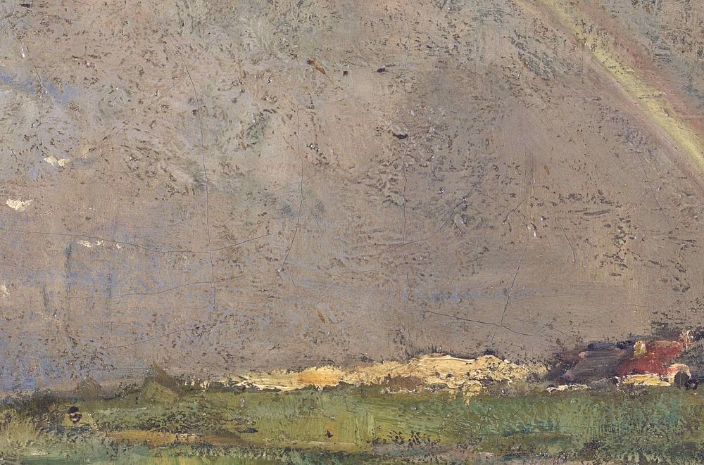 A rainbow over a flat landscape. Guillaume (Willem) Vogels (Brussels, 9 June 1836 - Ixelles, 9 January 1896) was a Brussels painter and watercolourist. A hinge between realistic landscape painting and an impressionist rendering of the play of light, he was introduced to easel painting while studying at the Academy of Fine Arts. In 1883, Vogels was involved in the founding of Les XX. He also became a member of the Belgian artists' association Les Hydrophiles, painting many pure landscapes, cityscapes and suburban views (often in bad weather). He rarely dated his works.