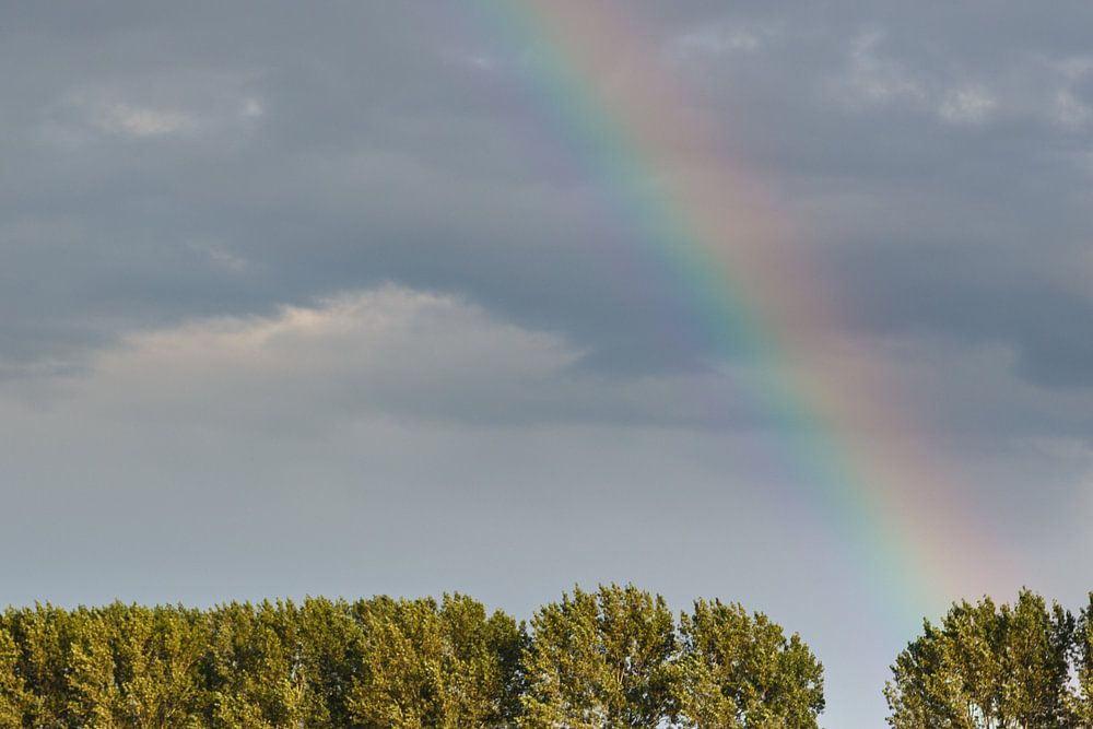 Ein Regenbogen über einer Baumallee in Ostfriesland.