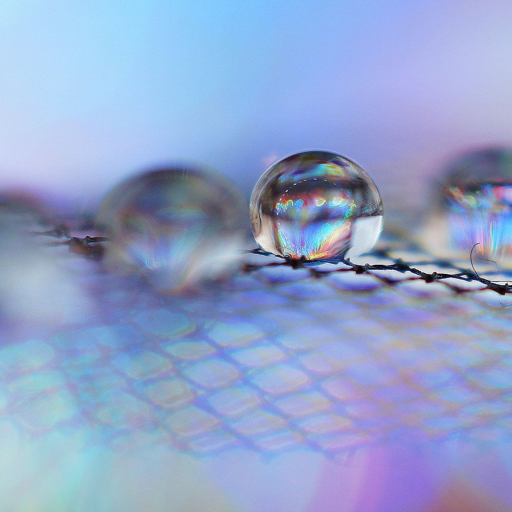 Several droplets on a piece of fabric. Rainbow colours can be seen in the background.