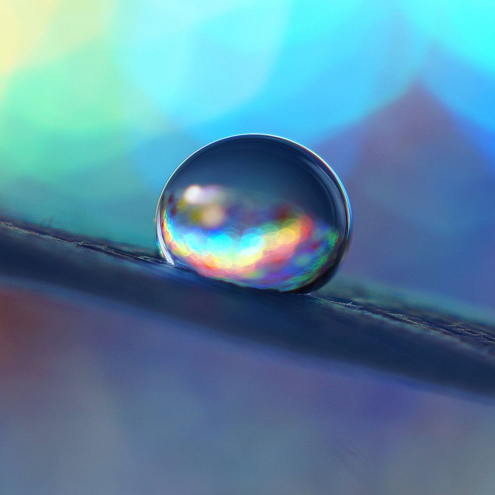 A droplet on a piece of fabric. Rainbow colours can be seen in the background.