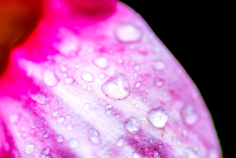 Raindrops on a pink flower. Photo was taken with a macro lens making the drops perfectly visible.