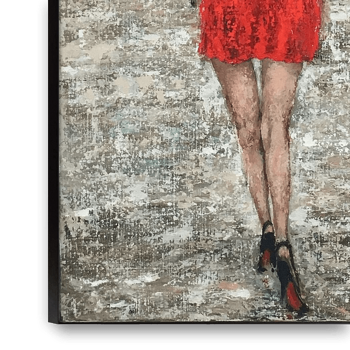 A woman lightly dressed with a red dress is walking in the street with an umbrella. In this contemporary painting we can enjoy a very nice contrast between the brown and grey surroundings and the lady in red. The rough background reinforces the work.