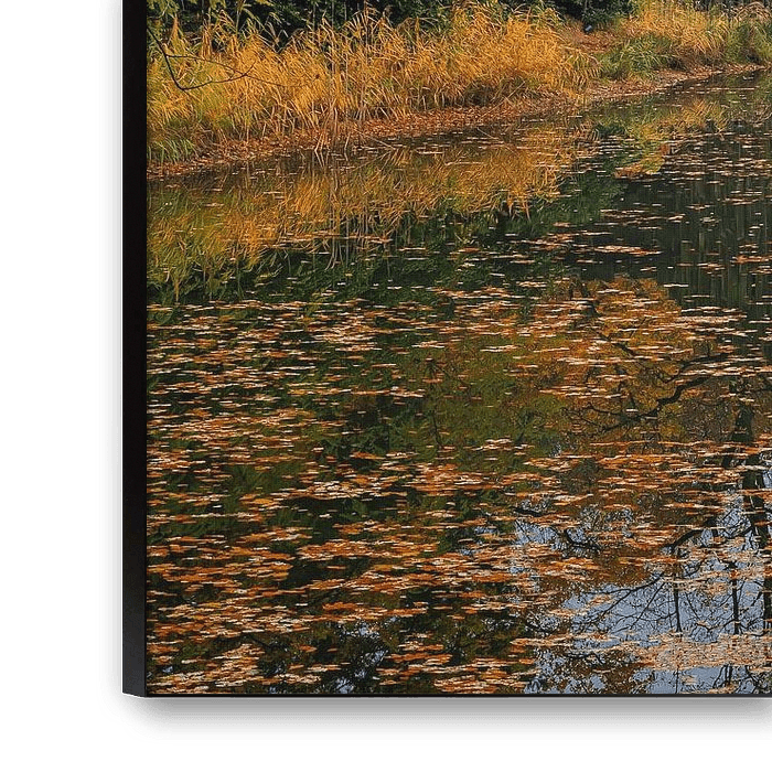The photo shows the famous stone arch reflected in the still lake, surrounded by colourful autumn foliage and soft diffused light from the overcast sky.