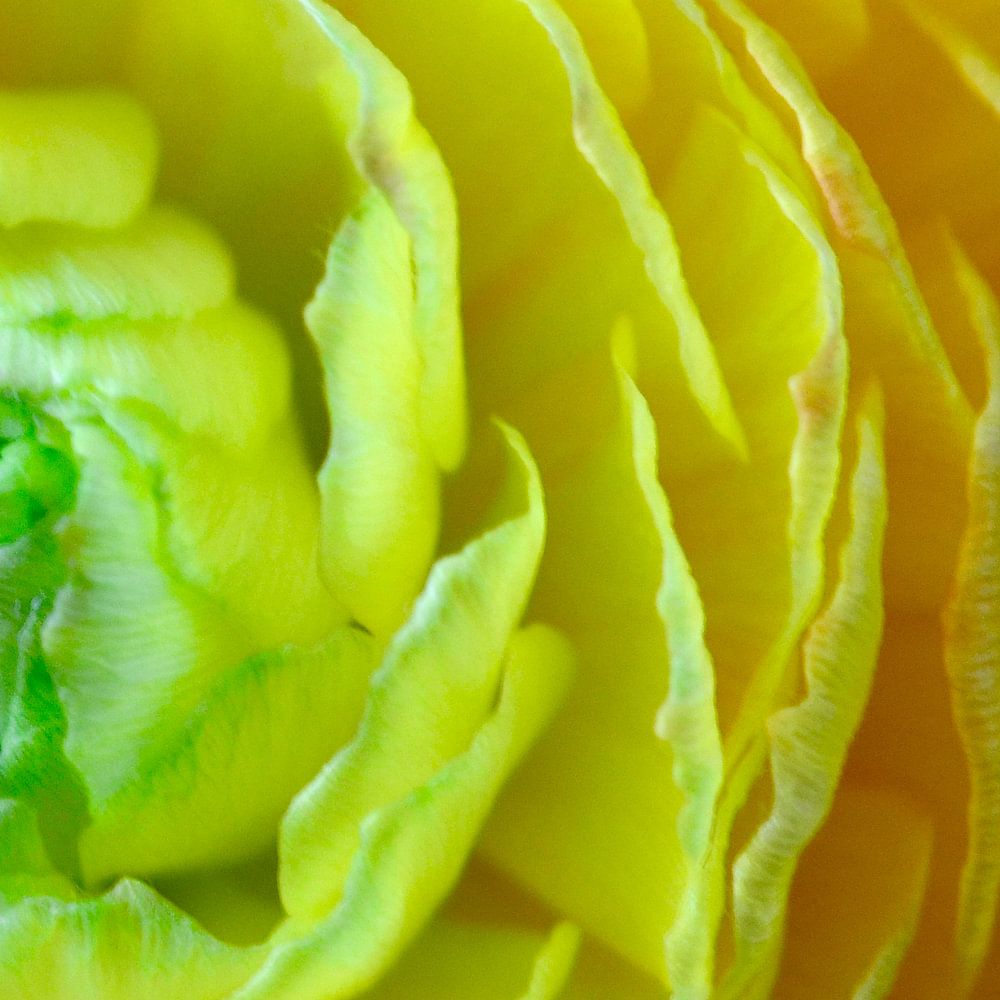 Ronde ranonkelbloem in vierkant vlak. Blaadjes hebben een kleurverloop van groen naar oranje.