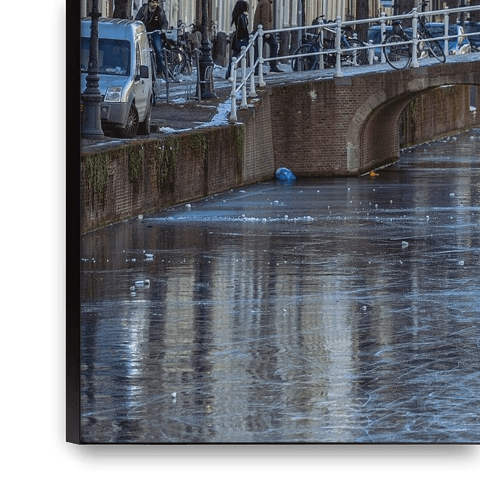A rare picture: a frozen Rapenburg with a few skaters who dare to go on the ice.