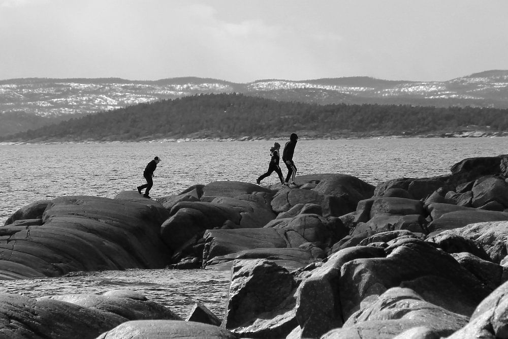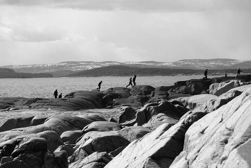 The picture shows a serene black-and-white composition of a rugged coastline, where several people are on the rocks. Some are standing, while others are walking or appear to be observing. The foreground consists of the rugged texture of the rocks, which add a vibrant texture. In the background, the sea stretches out, surrounded by…