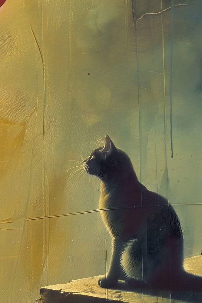 The cat's wistful expression and the dramatic setting create a poignant and memorable image.