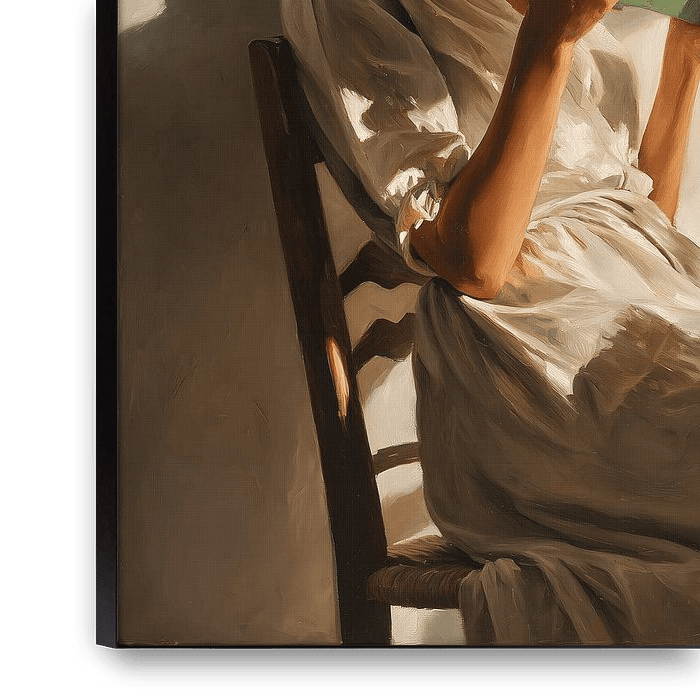 Bathed in warm sunlight, this intimate scene captures a quiet moment of escape through reading, filled with calm and timeless charm.