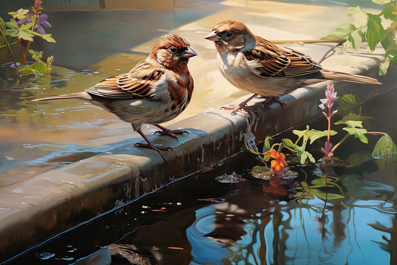 Realistic Sparrows – Two sparrows, depicted lifelike, balance on the edge of a water bowl, surrounded by subtle reflections and a colour palette of warm earth and water tones. The painting style is realistic with a stunning attention to detail, lending the canvas a calm, almost meditative atmosphere.