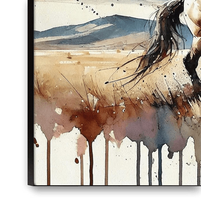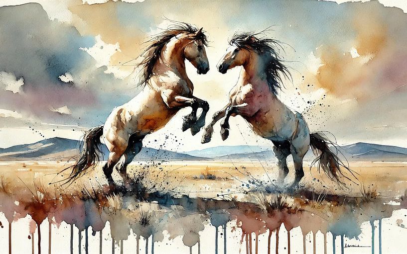 Two horses rear up face to face on an open plain, caught in a charged moment of strength and balance. Their bodies are built with warm sand, cream, and charcoal washes, while the manes fly in loose dark strands that emphasize motion. Small splashes rise from the ground like dust, and the wide sky behind them shifts through soft blue,…
