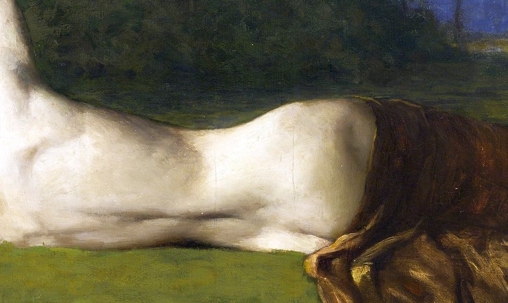 Painting, by an unknown artist, of a woman lying on her side and placed on her back in the portrait, a nude portrait. The maid lies partially under a gold and brown robe and reaches with her arm for a green grove. The model's ribcage, spine, shoulders, buttocks and hips have been exposed in the work of art.