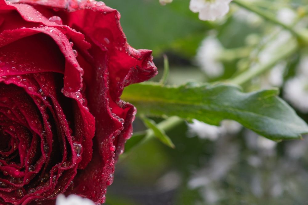 A red rose for love and romance placed on the table with some gypsophila around it.