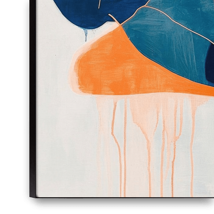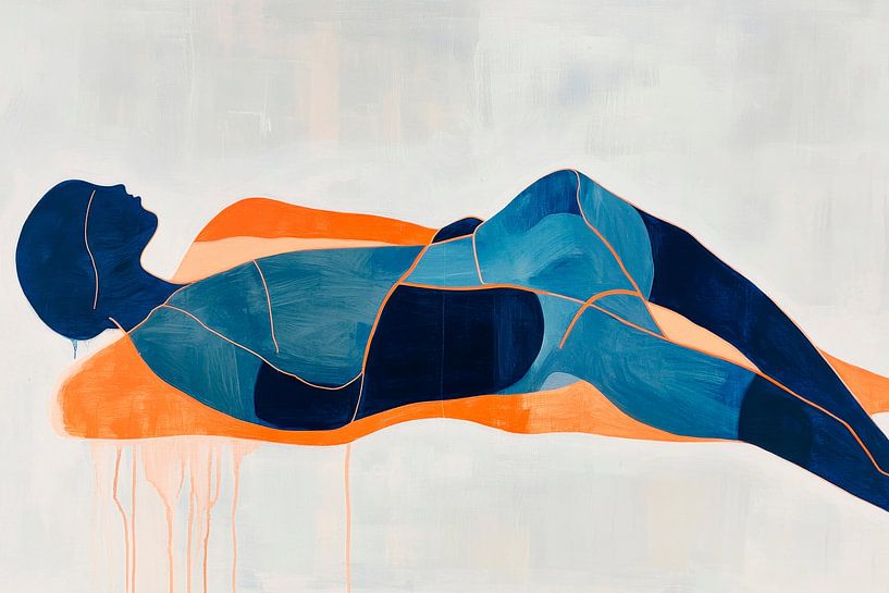 Soft blue and orange tones merge to create a harmonious composition that radiates relaxation and tranquillity. The contoured depiction of a casually reclining figure invites you to dream and brings a peaceful atmosphere to any room. Ideal for the bedroom to create a calming and inspiring environment.