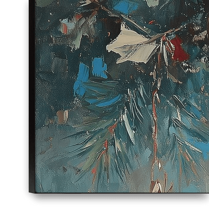 Red Ball - This is a Christmas ball painting of three large shiny baubles (red, gold, silver) hanging with strings between pine branches and red berries on a blue-green background, painted in a modern impasto/impressionist style, a clear Christmas ball painting and painting Christmas balls.