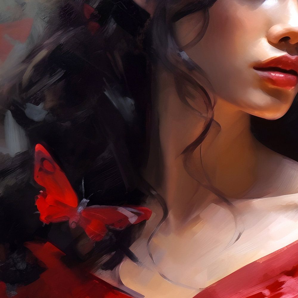 Impressionistic portrait of a woman with black hair in a red dress with red butterflies around her. Mixed media painting with coarse brushstrokes on canvas with a weathered grunge texture.