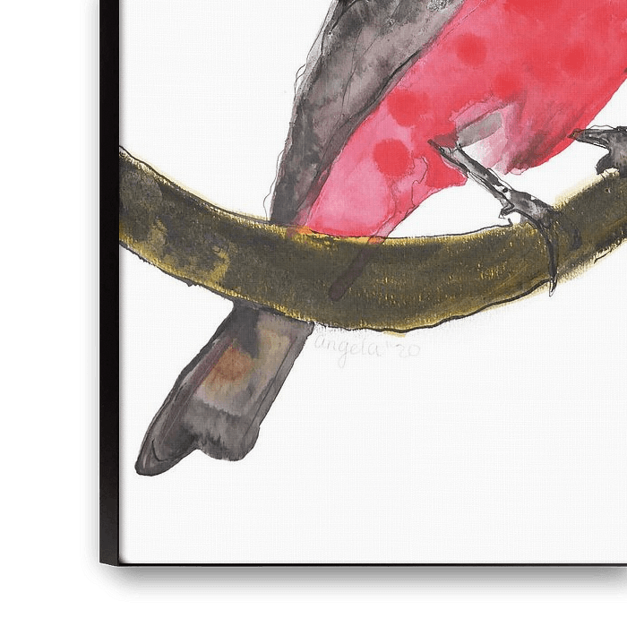 This is a poster/print of an original drawing of a Red Cardinal, which is made with acrylic paint east Indian ink, watercolor and charcoal. The artwork is then post-processed on the computer.