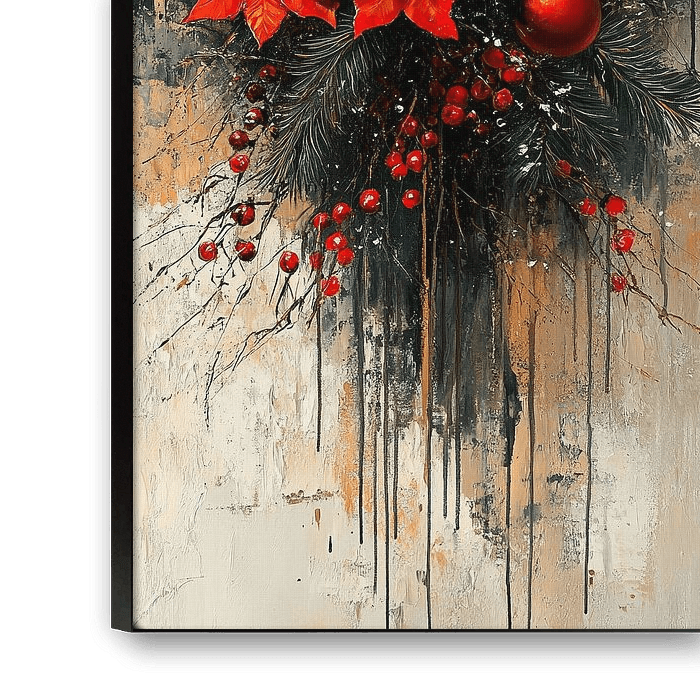 Red Christmas Decorations - This Christmas still life painting shows a vibrant composition of red, traditional poinsettias and shiny, golden baubles nestled among pine branches and red berries, all set against a rough, textured background with grey and beige tones.