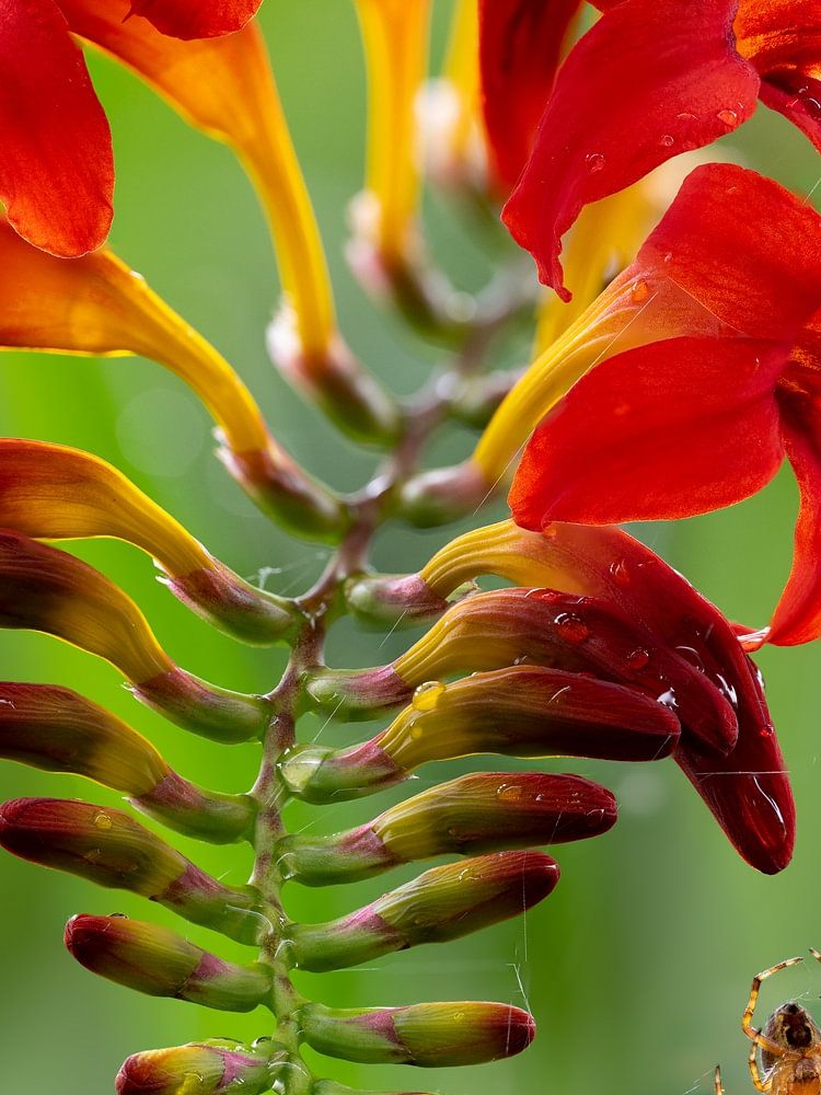 A beautiful red budding flower after a rainstorm with the cross spider having to rebuild its web and the water droplets glistening