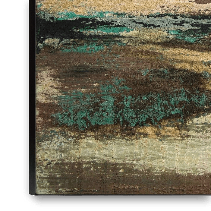 Layered, abstract landscape in chalk and lime paint. The lime and chalk paints have a unique powdery appearance that gives the layering an extra dimension. Various materials have been incorporated into the painting, such as paper, flax, textiles, coffee grounds and other materials.