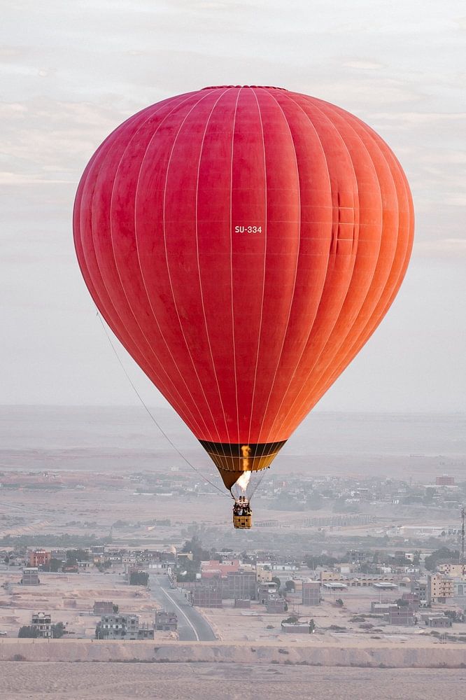 About "Red Hot Air Balloon Sunrise Temples Luxor, Egypt"
