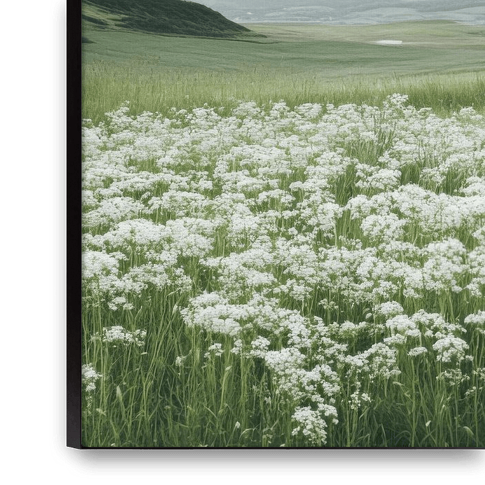 In the middle of a soft, green mud, a red cottage shines like a lonely dream from childhood. A calm, almost melancholy mood hovers over a sea of delicate white flowers, while the sky shimmers in soft shades of grey. This idyllic scenario invites you to listen to the silence and enjoy the boundless expanse of nature.