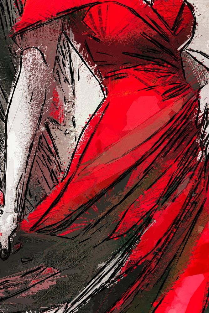 "Red Passion: Freedom in Motion" embodies the essence of strength, independence and femininity. The woman, dressed in a vibrant red dress, is at the centre of this artwork. Her confident posture and intense gaze are a testimony to her independent and powerful personality. The dynamic brushstrokes suggest movement and energy, with the red colour exuding passion and power. The combination of coarse brushstrokes and soft lines adds to the raw emotion of the artwork.