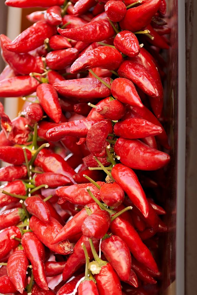 Deze rode pepers vind je overal in Calabrië. Mooi geknoopt wachtend op verkoop.