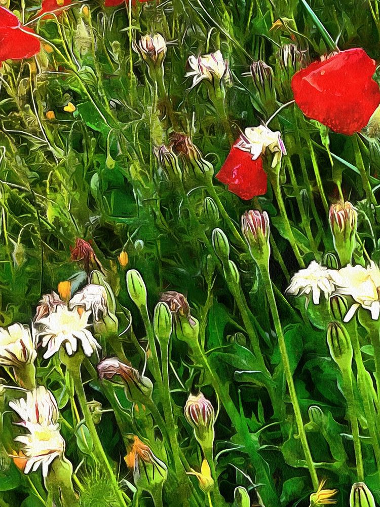 Spring in Umbria, Italy and the grassland and hedgerows are full of wildflowers. Mixing in with the wild flowers and tall grasses are Italian red poppies, wonderful splashes of red on the landscape. With this photo art image, I have tired to capture the constantly moving nature of a patch of grassland, full of wild flowers and red poppies raising their heads to be seen above the rest.