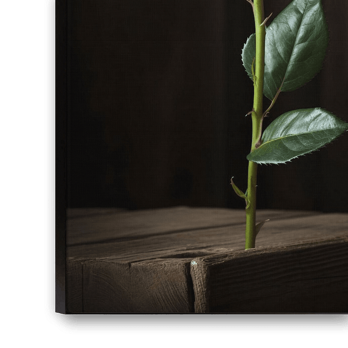 A single rose, elegant in its simplicity, stands proudly in the light. Her deep red petals unfold like the curtains of a theatre, heralding a performance of natural beauty. She is carefully placed against a dark background, which enhances her vibrant colour and the delicate texture of her petals. This rose embodies romance and passion without speaking a word. She is a timeless symbol of love and beauty, captured in a single, unforgettable moment. Perfect for any space that could use a touch of elegance and serenity.