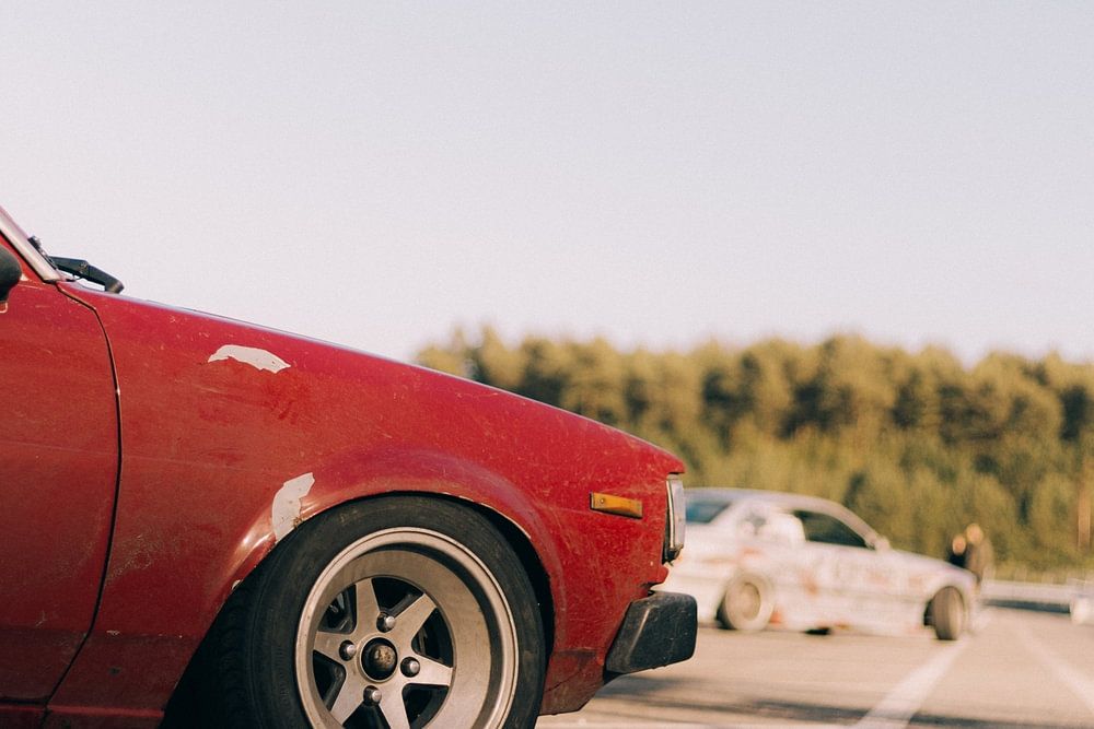The image concerns the side view of a red, Japanese vintage car parked next to a track in the pit lane. It was photographed during a drift event in Germany just before sunset.