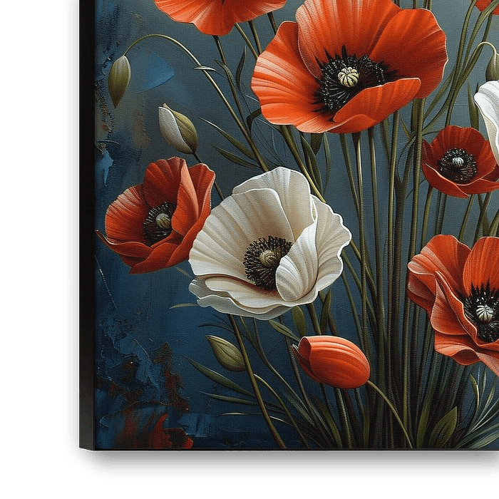 This painting shows a beautiful collection of red and white flowers against a serene blue background. The subtle contrasts and fine details of the petals invite the viewer for longer viewing pleasure. This artwork is ideal for those who want to enrich their interiors with a touch of natural beauty. The piece exudes tranquillity and fits perfectly in a modern or classically decorated room.