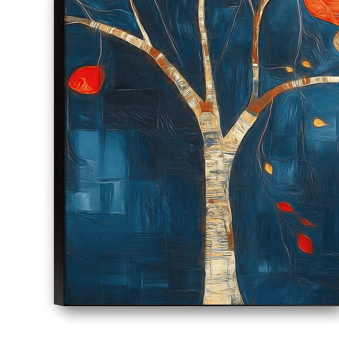A tree with branches that extend over a vibrant background. The leaves are in shades of red, orange and gold and create a striking contrast.