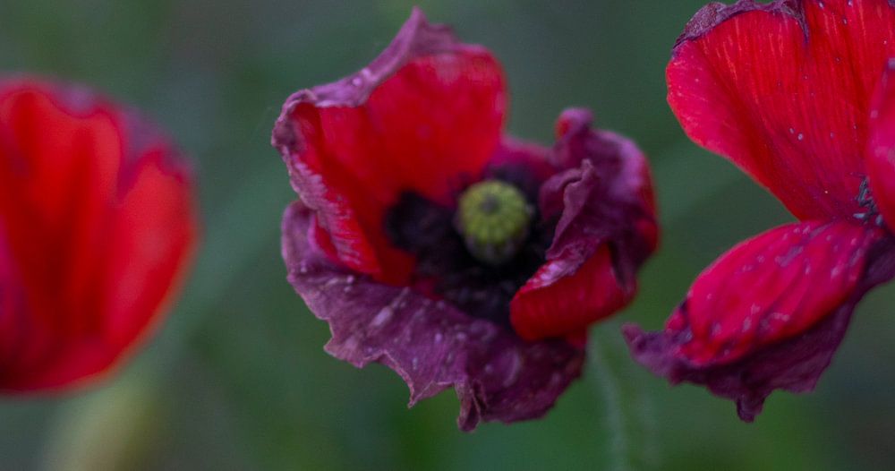 The distinctive colour of the poppy is red. At the base of the petals a black part becomes visible. The four leaves of the flower are larger than we are used to from flowers, so they overlap to a large extent. The flower has hairs on both stems and leaves.