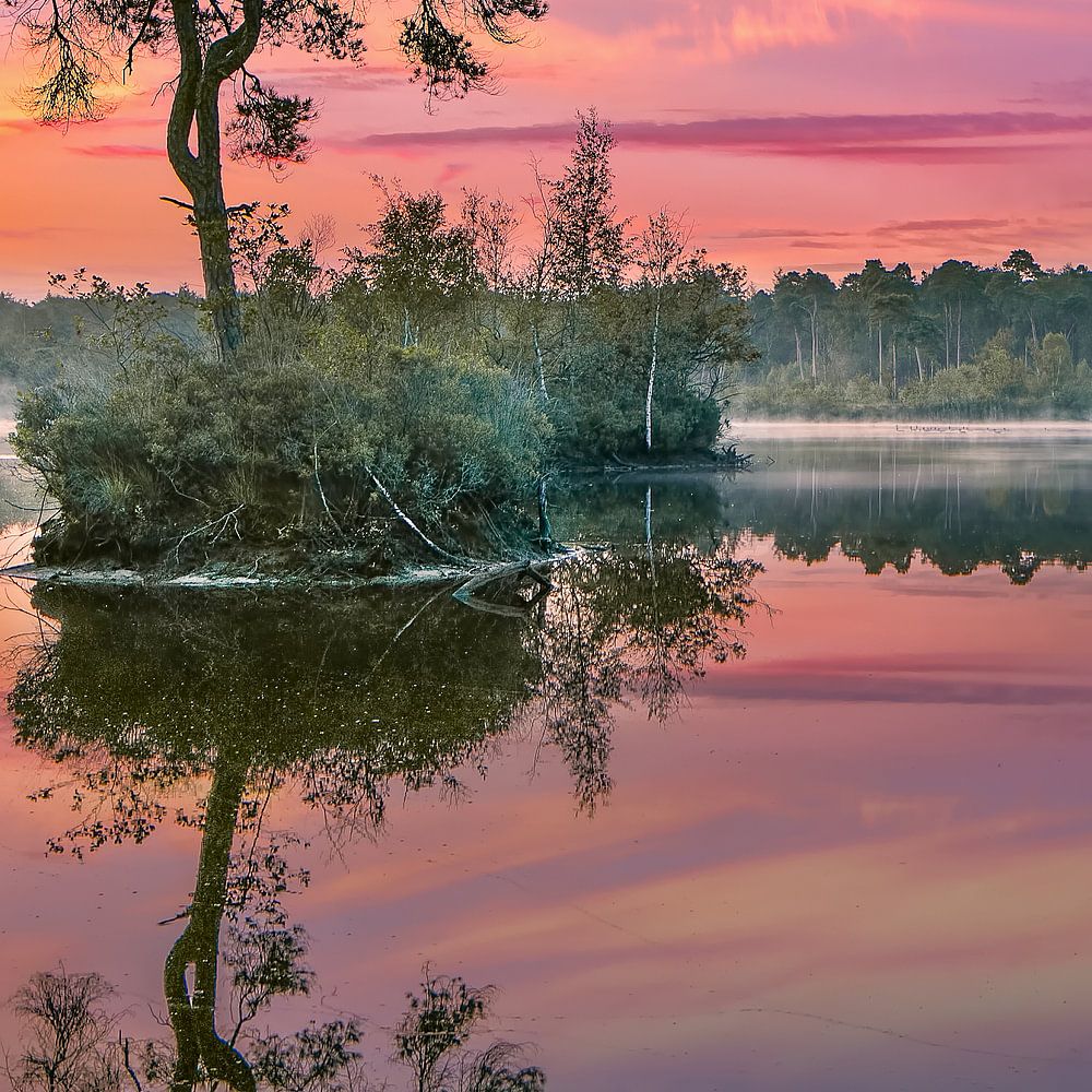 Red and turquoise sunrise reflected in a tranquil lake with a tree on a small island, misty quay and forest on the background, the Netherlands